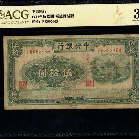 民国30年中央银行伍拾圆 福建百城版 复兴关牌坊