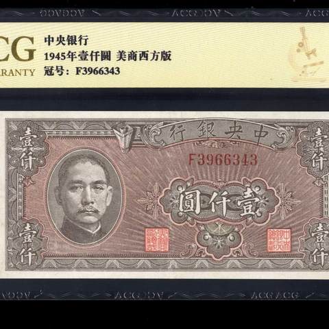 民国34年中央银行壹仟圆 美商西方厂