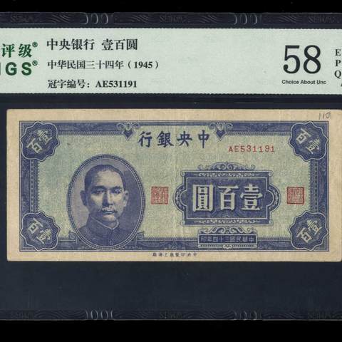 民国34年中央银行壹佰圆 中央上海厂