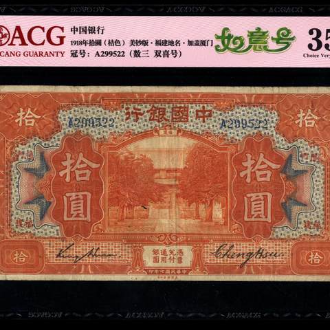 民国7年中国银行拾圆 福建厦门地名 美钞版