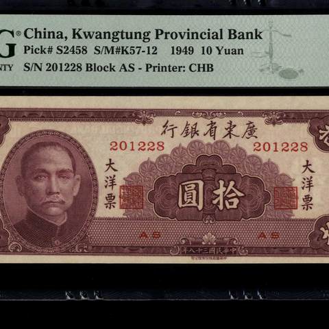 民国38年广东省银行大洋票拾圆